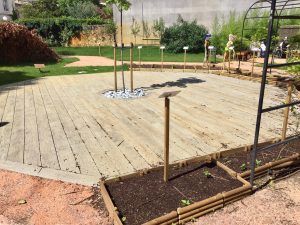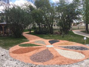 La fleur thérapeutique a été pensée par une apprentie du groupe BTS travaux paysagers comme un outil de travail pour les activités thérapeutiques portant sur la proprioception et la marche sur sol varié.