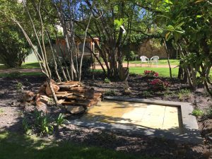 La fontaine « miroir d’eau » amène un léger bruit apaisant d’eau qui coule sur les pierres. L’eau termine sur une surface lisse en miroir.