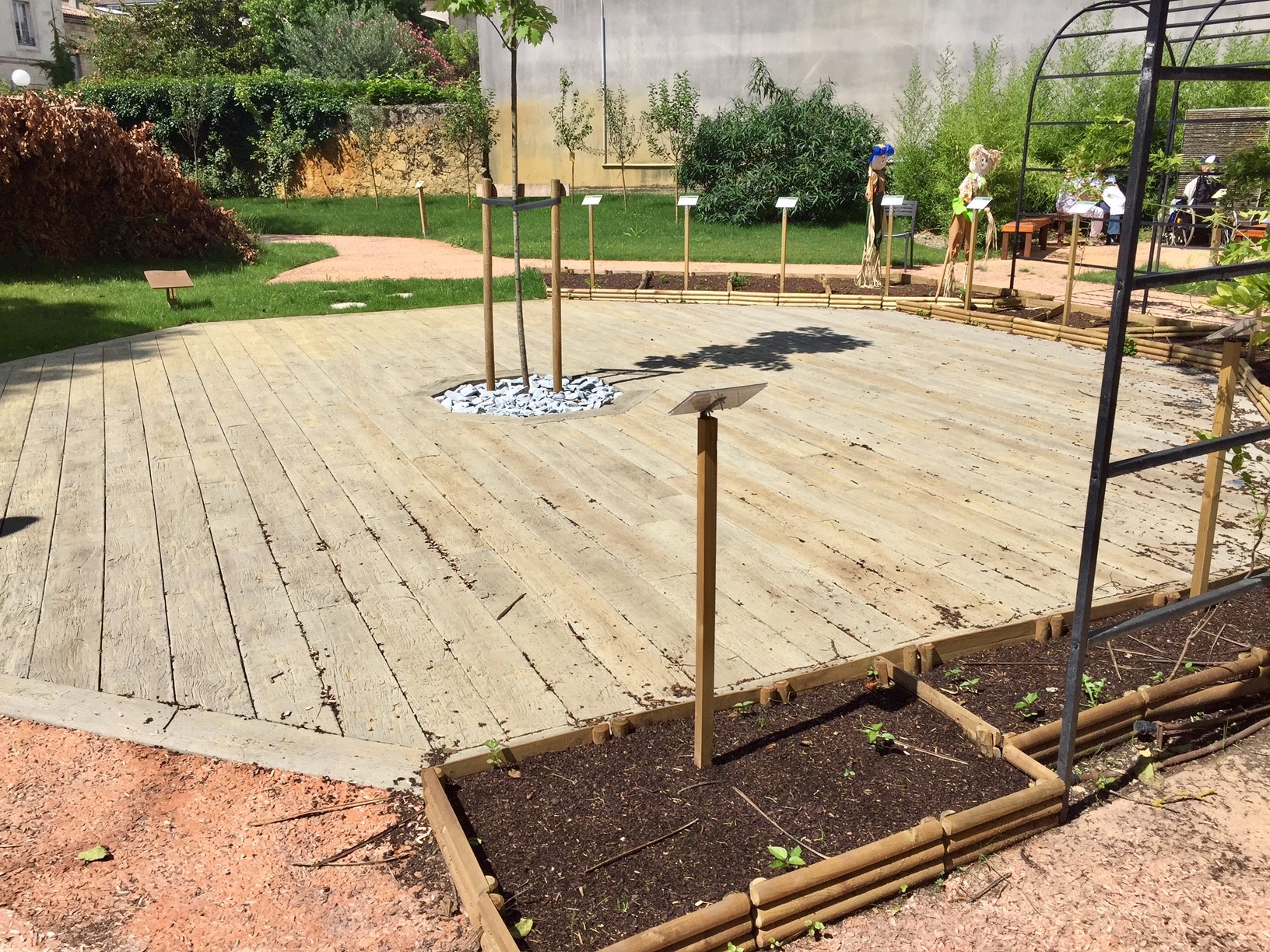 Structuré autour des 5 sens, le jardin est conçu comme un parcours initiatique à la fois apaisant et soignant pour permettre un réinvestissement du corps, la (re)découverte de sensations, un espace pour entrer en relation avec une population composée majoritairement de personnes âgées en perte d’autonomie ou en fin de vie mais aussi de personnes atteintes de maladies graves et évolutives.